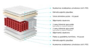 Šiame čiužinyje naudojamos viskoelastinės putos yra moderni medžiaga, kurios minkštumas suteikia naudotojui miegojimo ant debesies jausmą. Be to, „Visco“ viskoelastinės putos yra hipoalerginės ir atsparios kenksmingoms dulkių erkutėms bei grybeliams. Čiužinio šerdyje yra 7 zonų kišeninės spyruoklės, kurios užtikrina tinkamą kūno atramą miego metu. Kiekviena spyruoklė veikia atskirai savo kišenėje, reguliuodama atramos jėgą pagal apkrovą. Kišeninės spyruoklės užtikrina tylų visos sistemos veikimą. Čiužinys tiekiamas su užtrauktuku užsegamu, skalbiamu užvalkalu.
