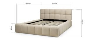 Lova aptraukta minkštu, nesenstančio smėlio atspalvio audiniu, todėl tinka daugeliui interjero dizainų. Aukštas galvūgalis ne tik suteikia unikalią išvaizdą, bet ir patogią atramą vakaro poilsiui su knyga ar filmu.